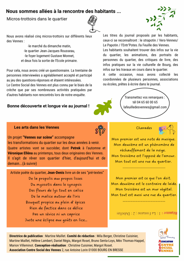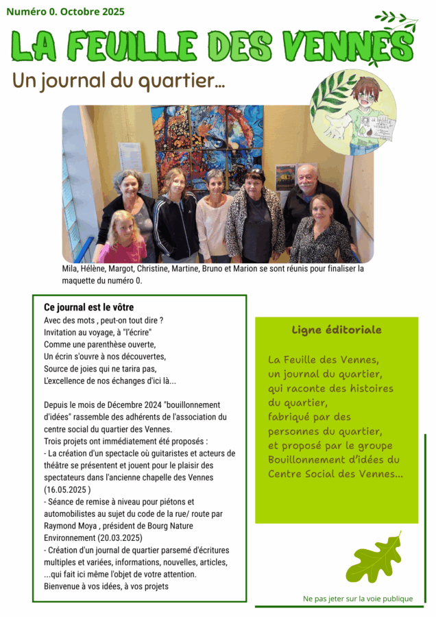 Depuis début 2025, un groupe émanant des séances bouillonnement d’idées, travaille sur l’édition d’un journal, d’une gazette, d’un feuillet… et finalement d’une feuille des Vennes. 🌿