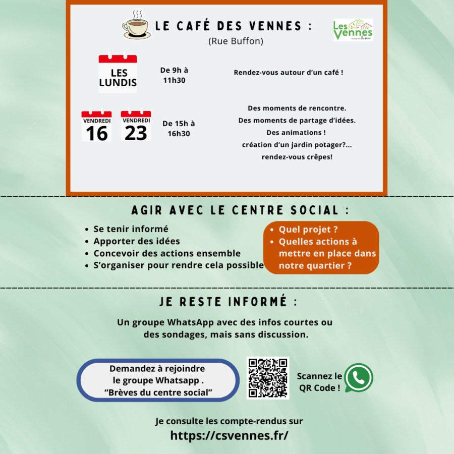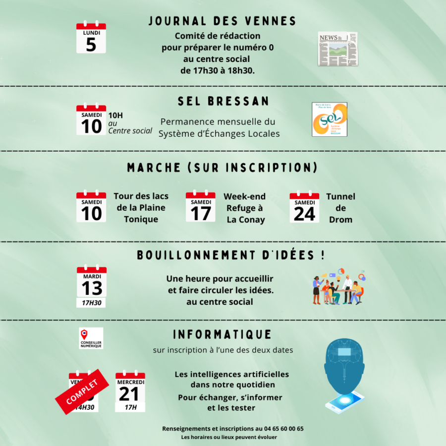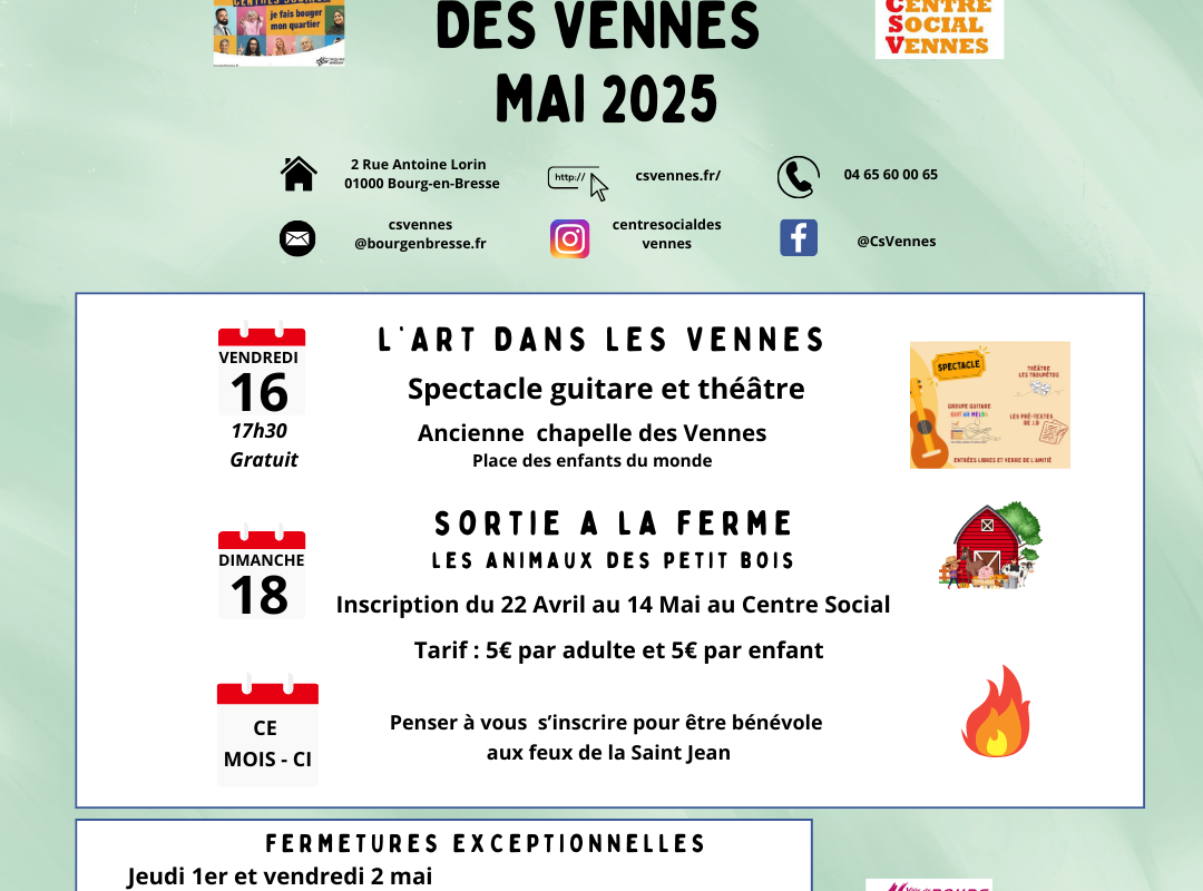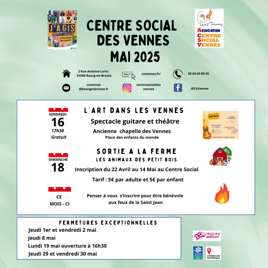 Voici le programme du centre social des Vennes pour le mois de mai 2025 :