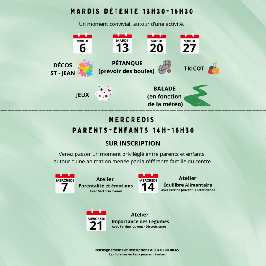 – Mardis 6, 13, 20, 27 : Décos Saint Jean, Pétanque, Tricot, Jeux, balade (en fonction de la météo).