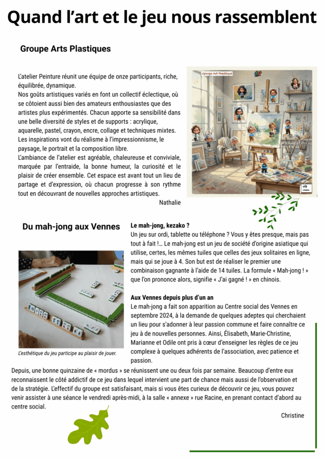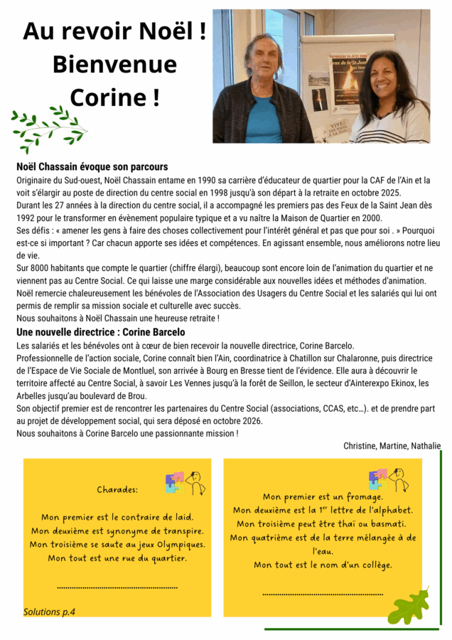 Vous pourrez retrouvé des nombreux articles comme : sur la vitesse dans le quartier, sur des activités du Centre Social (Mah-jong, Arts Plastiques), le changement de direction avec le départ à la retraite de Noël et l’arrivée de Corine, des charades. Mais aussi sur la dernière page, quelques informations en bref et un agenda avec les dates importantes.