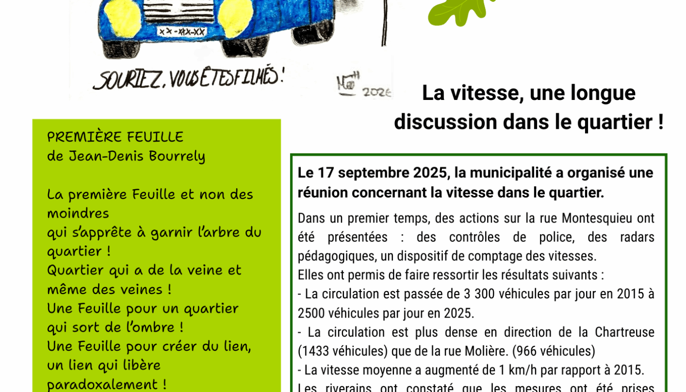 Vous pourrez retrouvé des nombreux articles comme : sur la vitesse dans le quartier, sur des activités du Centre Social (Mah-jong, Arts Plastiques), le changement de direction avec le départ à la retraite de Noël et l’arrivée de Corine, des charades. Mais aussi sur la dernière page, quelques informations en bref et un agenda avec les dates importantes.