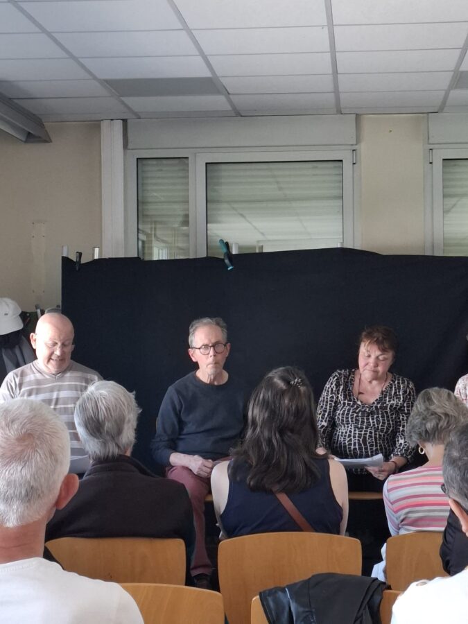 Ce jeudi, nous avons pu écouter Noël, Jean-Denis, Martine, Christine, et Hélène qui ont lu sur scène la lecture de leur carnet. Ce carnet fut réalisé de A à Z par les habitants du quartier (de l’écriture jusqu’à la reliure)